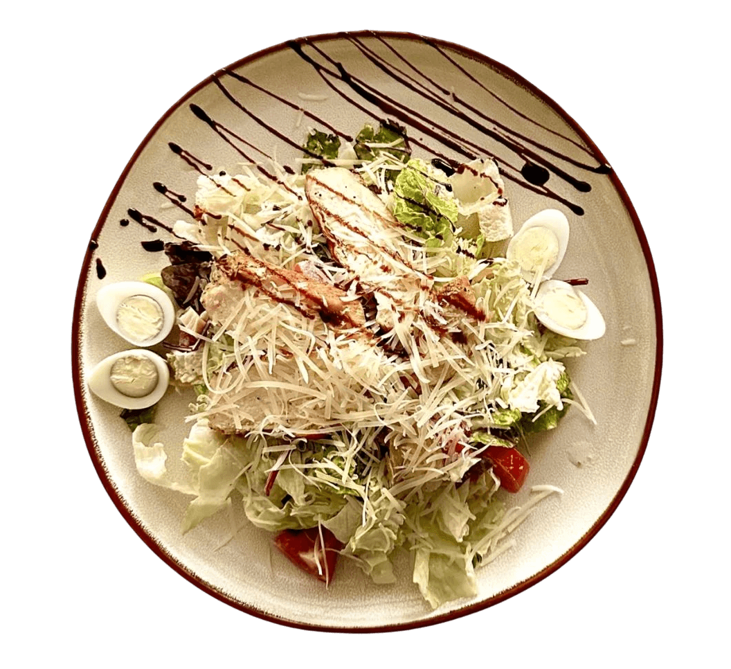мікс салату, куряче філе, бекон, сир пармезан, перепелині яйця, томати чері, грінки, соус Цезар