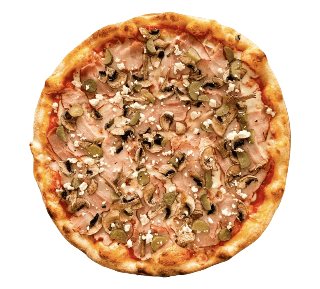 томатний соус, сир моцарела, шинка,бекон, огірок маринований, печериці, бринза
