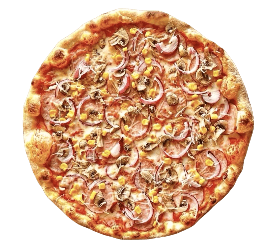 томатний соус, сир моцарела, салямі, печериці, кукурудза, червона цибуля, сир пармезан