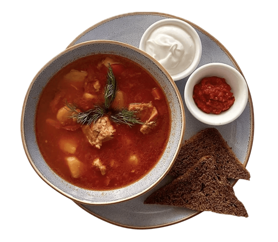 гострий наваристий суп на основі м’ясного бульйону із трьох видів м’яса, копченостей та овочів.
